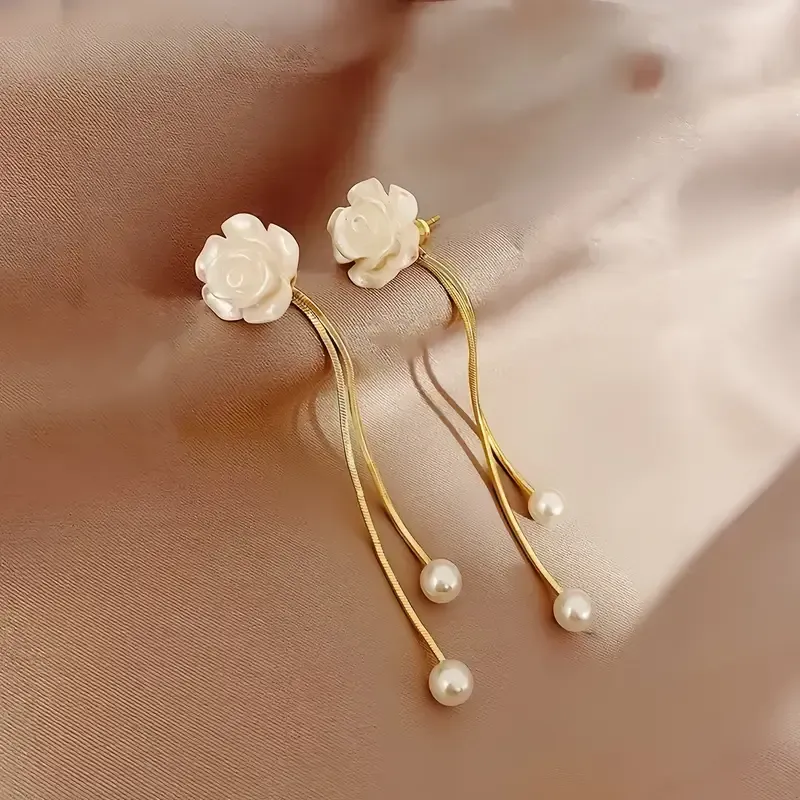 أقراط زهرة الكاميليا بالؤلؤ المتدلي Boucles d’Oreilles Perle Camélia avec Pampillesالأكثر مبيعا